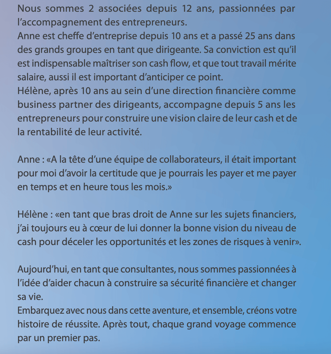 "Anne et Hélène m'ont fait prendre conscience que j'avais besoin de mieux piloter mon business et mon cash pour avoir de meilleurs résultats. Et ça marche !"